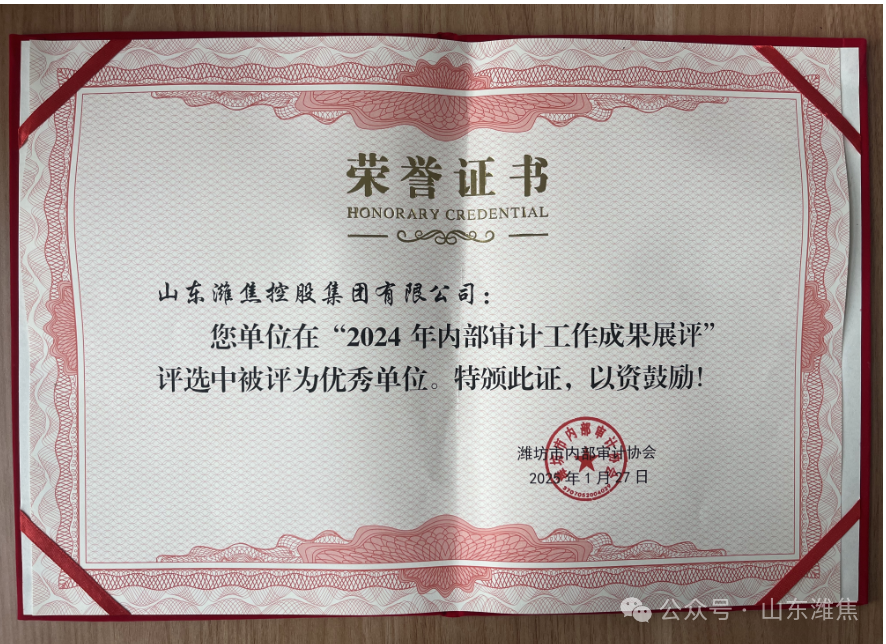 近日,潍坊市内部审计协会组织2024年全市内部审计工作成果展评,集团公司荣获“2024年内部审计工作成果展评优 秀单位”称号。